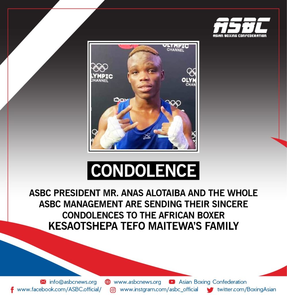 The President of the Asian Boxing Confederation and Vice-President of the International Boxing Association (AIBA) Mr. Anas Alotaiba, furthermore the whole ASBC management are sending their sincere condolences to Botswana’s Mr. Tefo Maitewa’s family following the young boxer passed away at the age of 22 due to brain cancer.