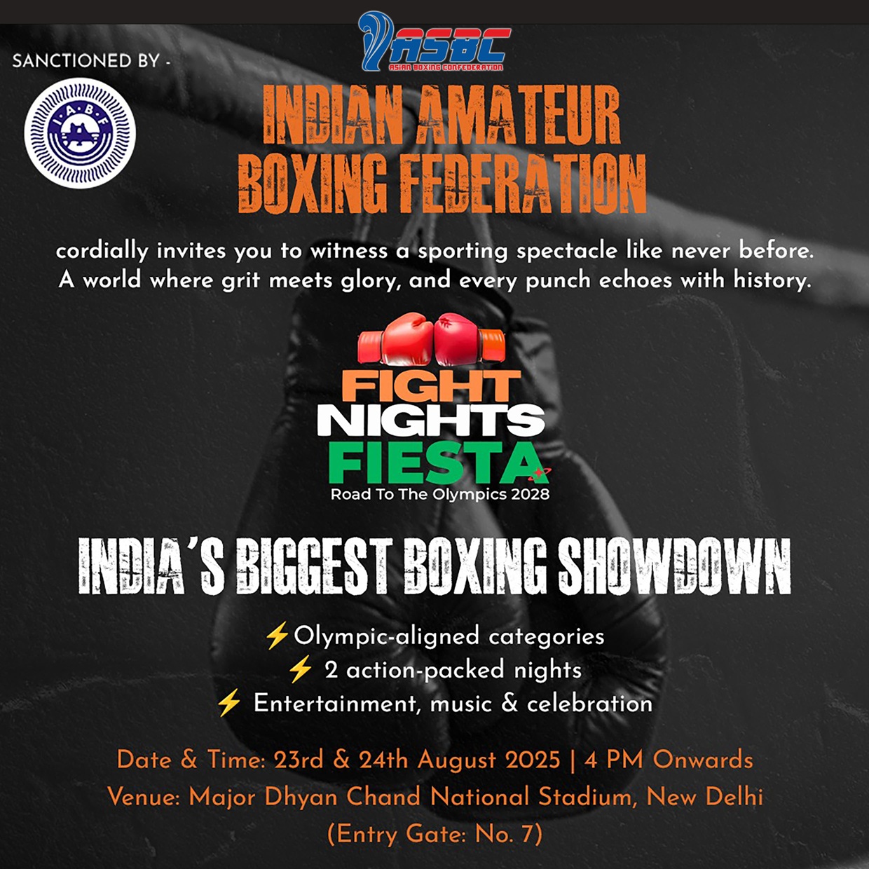 The slogan of the Indian Fight Night Fiesta is “A World where grit meets glory, and every punch echoes with history”.