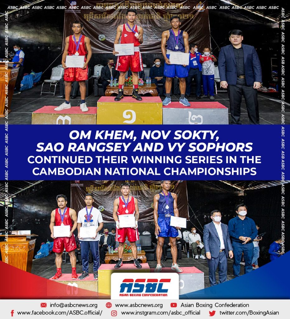 Vy Sophors achieved medals in several previous editions and after a short break, he returned to the top of the podium after beating Ieng Chanleak at the welterweight (67kg). Moeun Sokhuch moved up to the new light middleweight (71kg) and defeated Chhoeung Lvey in the final. Chhoun Manh was titleholder at the middleweight (75kg) and continued his winning path against Keo Samrith in the new edition of the Nationals.
