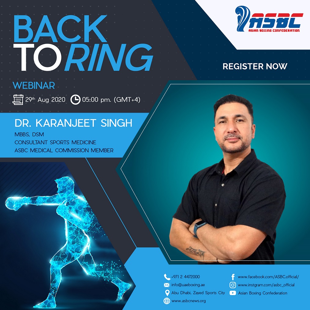 Dr. Karanjeet Singh is a Sports Medical Consultant who has strong experiences in that field and his new project named Back to the Ring. The exact time of the Back to Ring Webinar is at 5pm (GMT +4) on August 29 in 2020. The new Webinar will contain theoretical and practical medical guidelines for the officials, boxers, referees & judges and coaches to return to the sport events and to the ring safely.