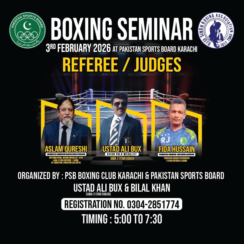 The Pakistan boxing Federation organized a Referee/ Judge seminar on February 3, 2026 with the collaboration of the Sindh Bthe oxing Association and Pakistan Sports Board Karachi centre.